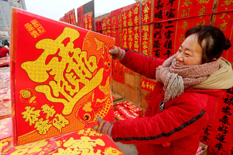 ↑ 2月14日,在浙江省嘉兴市南湖区一家大型商场“年货一条街”,市民在选购福字。新华社发(金鹏 摄)