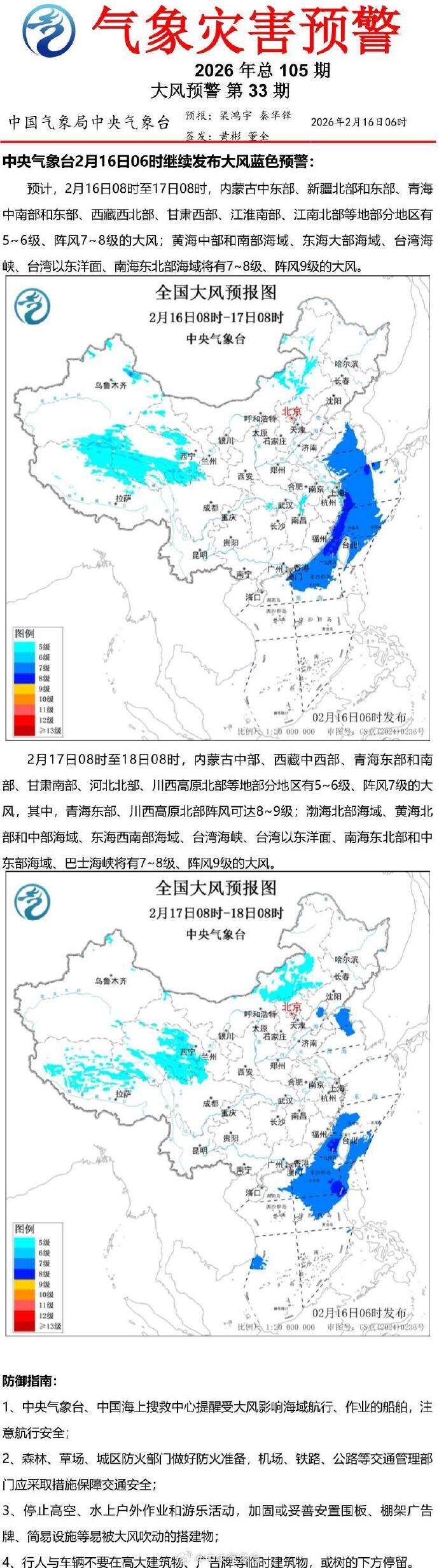 中央气象台2月16日06时继续发布大风蓝色预警。