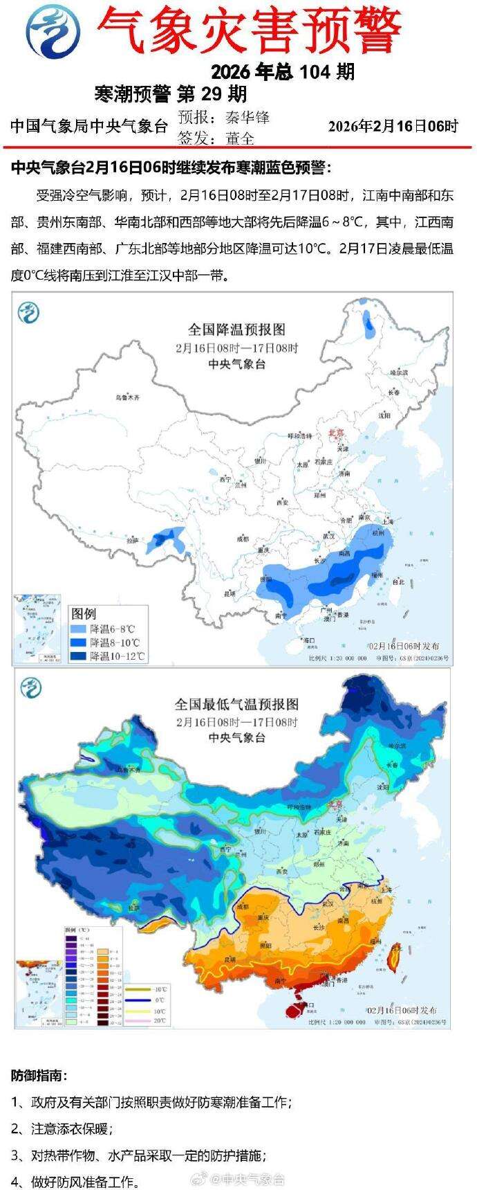 中央气象台2月16日06时继续发布寒潮蓝色预警。