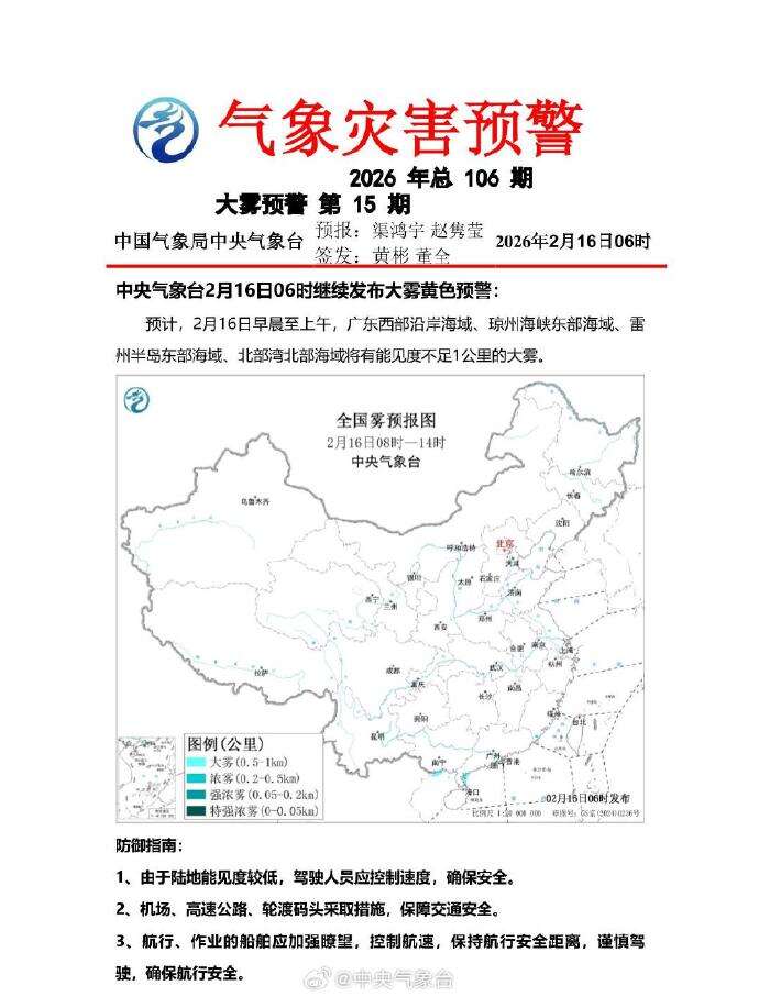 中央气象台2月16日06时继续发布大雾黄色预警。