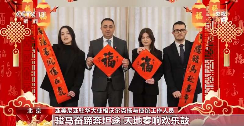 亚美尼亚驻华大使格沃尔克扬与使馆工作人员:骏马奋蹄奔坦途,天地奏响欢乐鼓。亚美尼亚驻华使馆祝大家,春节快乐,一马当先。