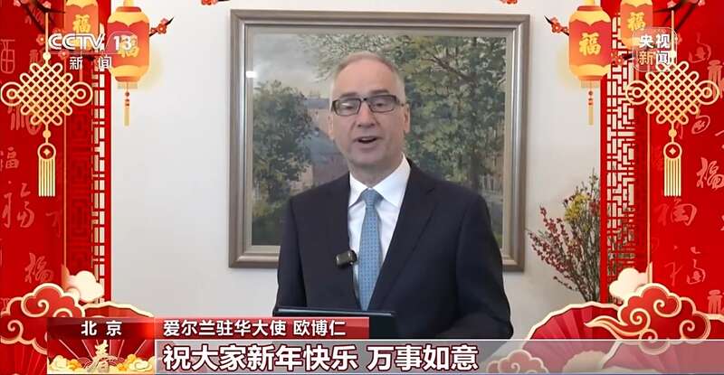 爱尔兰驻华大使 欧博仁:春天将至,白昼渐长……这是安东尼·拉夫特里写的一首咏春诗。 我谨代表爱尔兰人民,祝大家新年快乐、万事如意。用我们传统的爱尔兰语说就是:马年快乐。
