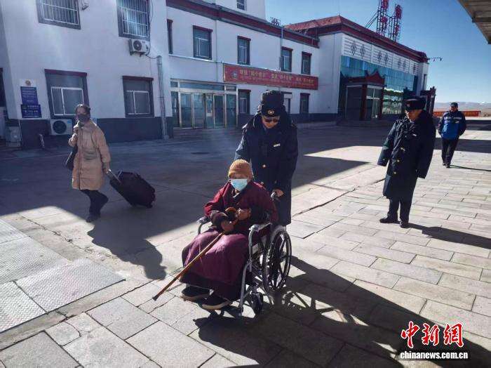 图为青藏铁路那曲站客运工作人员帮助腿脚不便的老人乘车。拉萨车务段 供图