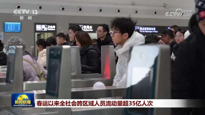 央视网消息(新闻联播):记者从交通运输部获悉,2月16日,全社会跨区域人员流动量超2.2亿人次,比2025年同期增长8.9%。春运启动以来,全社会跨区域人员流动量累计超35亿人次。