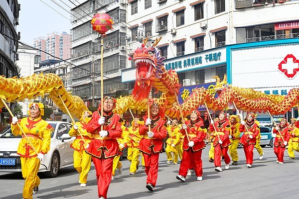 2026年2月18日,湖北英山,民间艺人进行民俗节目巡街表演,吸引市民驻足观看。