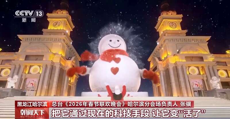 总台《2026年春节联欢晚会》哈尔滨分会场负责人 张骥:当时在看到这个网红雪人之后,我们想,首先雪人要做一个呈现,就想到了咱们的国产动画片《雪孩子》的这个场景,把它通过现在的科技手段让它变“活了”。然后把群力广场幻化成一个冰场,很浪漫、很温馨的这么一个两个人在冰上共舞的场景。
