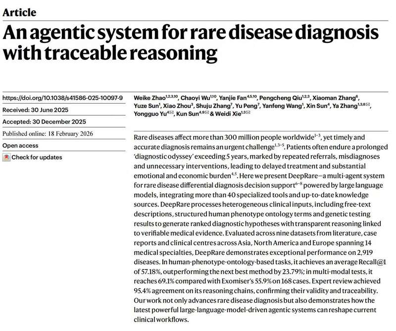 2月19日凌晨,上海交通大学医学院附属新华医院孙锟教授、余永国教授领衔团队与上海交通大学张娅教授、谢伟迪副教授领衔团队联合研发出一款能看罕见病的人工智能系统,相关成果北京时间2月19日在国际顶尖期刊《自然》上发表。这套名为DeepRare的系统,被称作全球首个“推理过程可追溯”的罕见病智能医生。