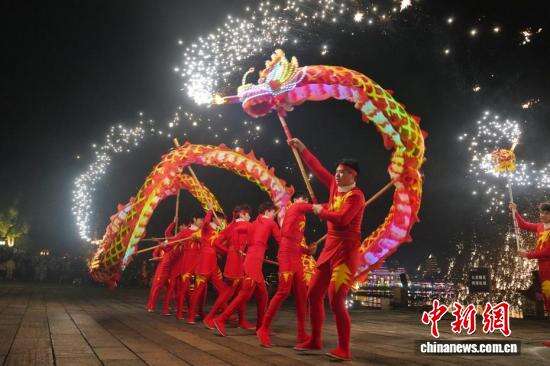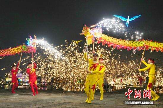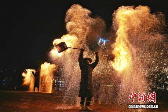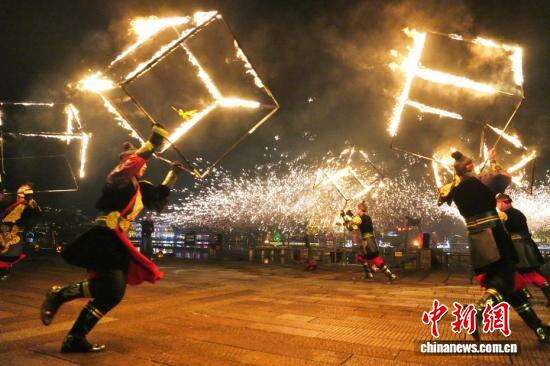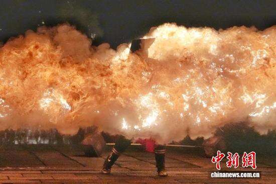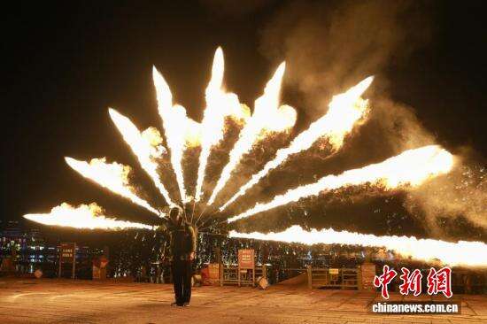 2月19日,大年初三,长沙铜官窑古镇的舞火龙、火壶、火魔方等火艺表演轮番登场,将非遗表演与创意火艺融合,庆祝新春佳节。图为表演者表演舞火壶。