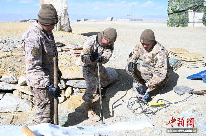 图为在5592哨所,战士们在维修台阶。赵朗 摄