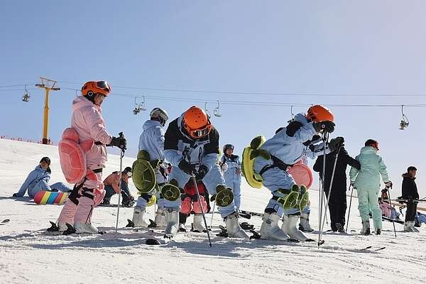 众多游客在滑雪场体验冰雪运动