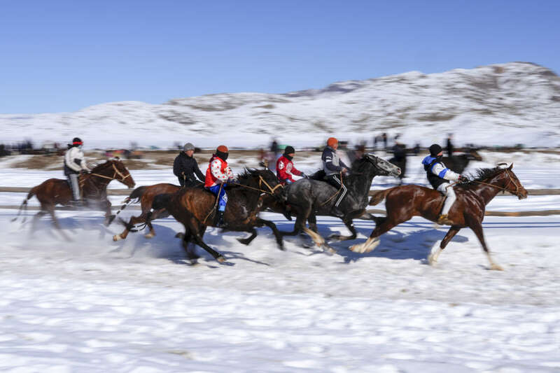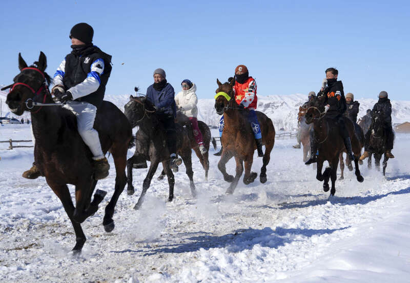 在新疆青河县狼山景区赛马场,当地群众开展赛马活动欢度新春佳节(2月17日摄)。新华社发(叶尔江·木哈买提 摄)