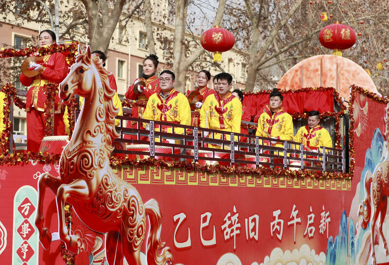 在新疆和田地区洛浦县举办2026年春节社火展演中,各族群众在表演中(2月17日摄)。新华社发(买买提艾力·艾尼瓦尔 摄)