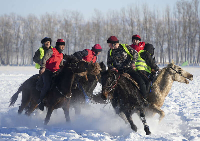 在新疆昭苏县萨尔阔布镇,当地牧民在参加叼羊比赛欢度新春佳节(2月14日摄)。新华社发(塔力哈尔·叶尔江 摄)