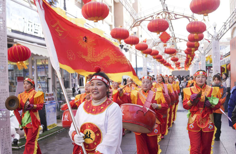 在乌鲁木齐大巴扎步行街,人们在参加社火表演(2月20日摄)。新华社发(李嘉华 摄)