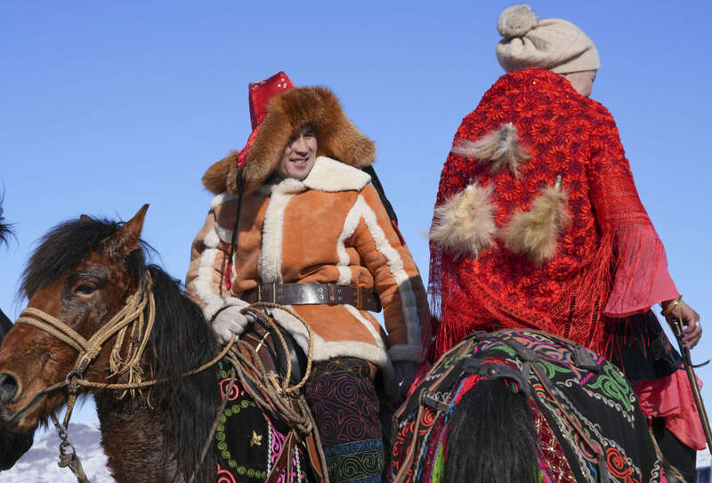 在新疆青河县狼山景区赛马场,当地群众参与马上运动“姑娘追”欢度新春佳节(2月17日摄)。新华社发(叶尔江·木哈买提 摄)