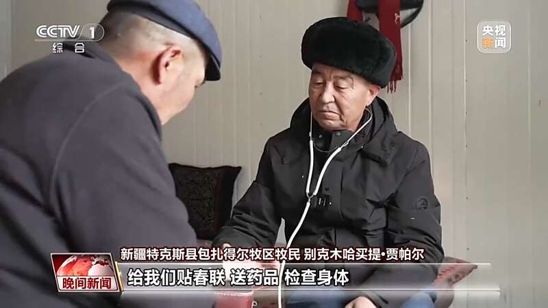 新疆特克斯县包扎得尔牧区牧民 别克木哈买提・贾帕尔:居马泰・俄白克医生又来看我们,给我们贴春联、送药品、检查身体,我们心里特别暖,特别感动!