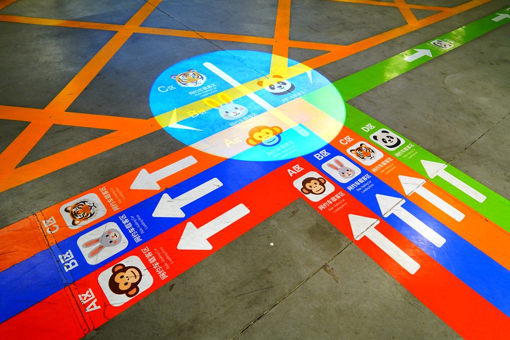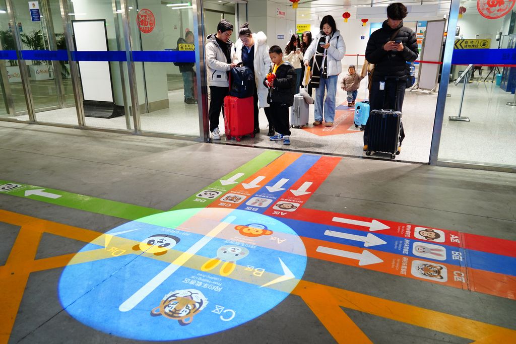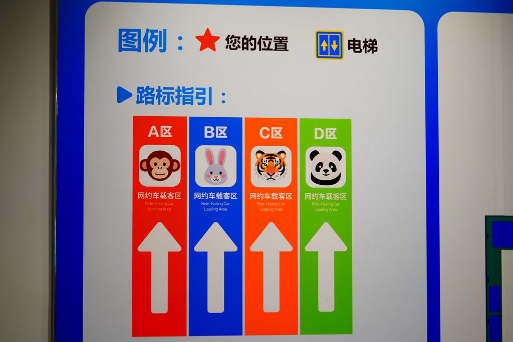 2026年2月26日,北京,朝阳站内上新的导视设计,旅客在停车场找网约车等更方便了。据了解:这是北京印刷学院为车站设计的分区导视,通过不同颜色和符号帮助旅客有效缓解找路焦虑。根据网约车停车场4个分区,师生分别以猴、兔、熊猫、老虎4种动物分区,还为每个分区定制专属主题色:猴区灵动红、兔区清湛蓝、熊猫区竹叶青、虎区琥珀橙,颜色既与动物形象契合,又具有较强的视觉区分度。