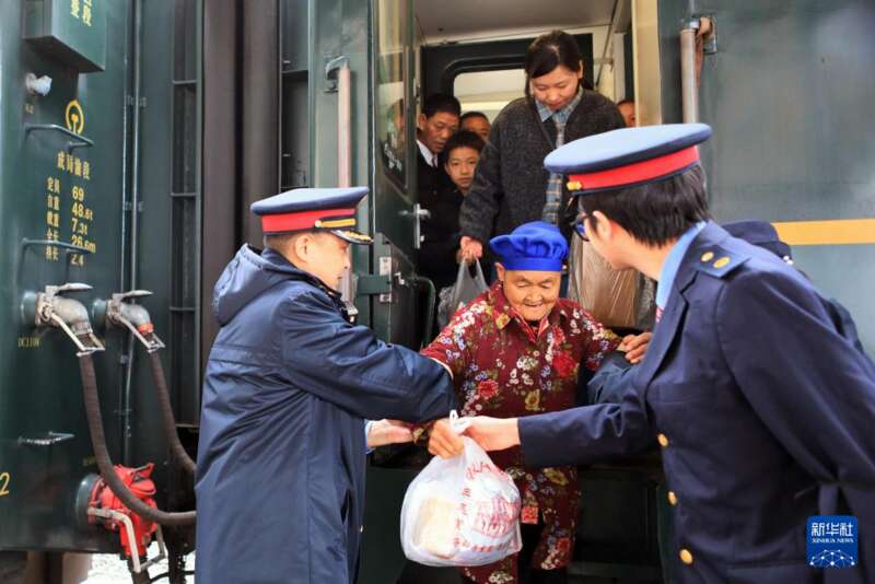 2月25日,村民们在5630次列车上交流。