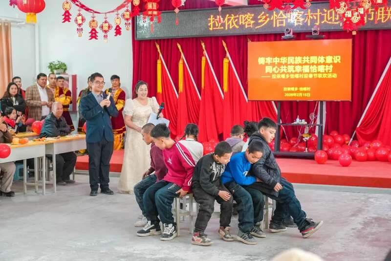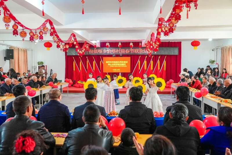 在于田县奥依托格拉克乡兰干吾斯塘村的春节联欢晚会上,村里文艺队彩绸翻飞间扭起秧歌舞,村民自编的乡村生活趣事小品逗得观众哈哈大笑,互动游戏“猜灯谜”“抢凳子”点燃了年味与现场气氛。