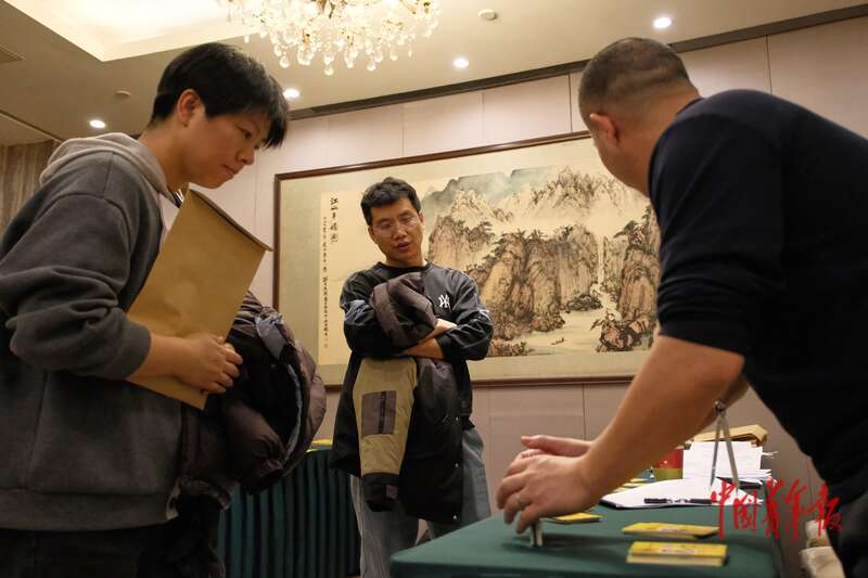 2月27日,北京梅地亚中心,境内记者在领取记者证,一名记者在拍摄2026年全国两会预热视频。中青报·中青网记者 田嘉硕/摄