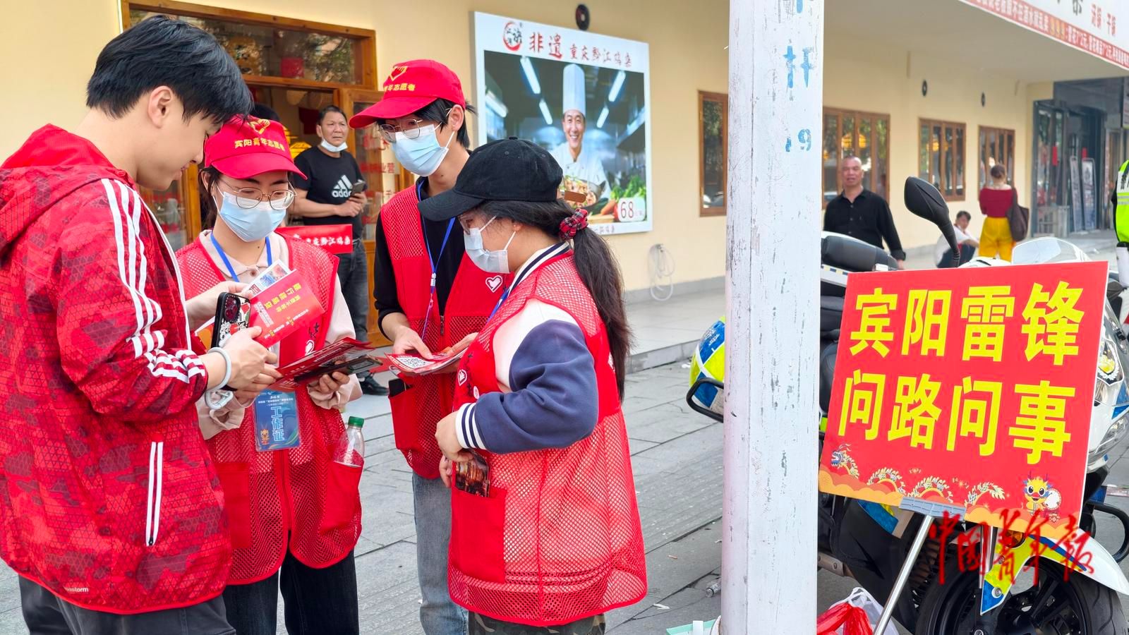 2月27日,广西南宁市宾阳县思远路,宾阳县青年志愿者为游客提供咨询服务。为助力2026年宾阳炮龙节顺利举办,共青团宾阳县委员会在2月27日当天组织了130余名青年志愿者分布在26个主要路口和炮龙文化广场开展志愿服务工作,为游客提供问路指引,停车区域引导等咨询服务。中青报·中青网记者 谢洋/摄