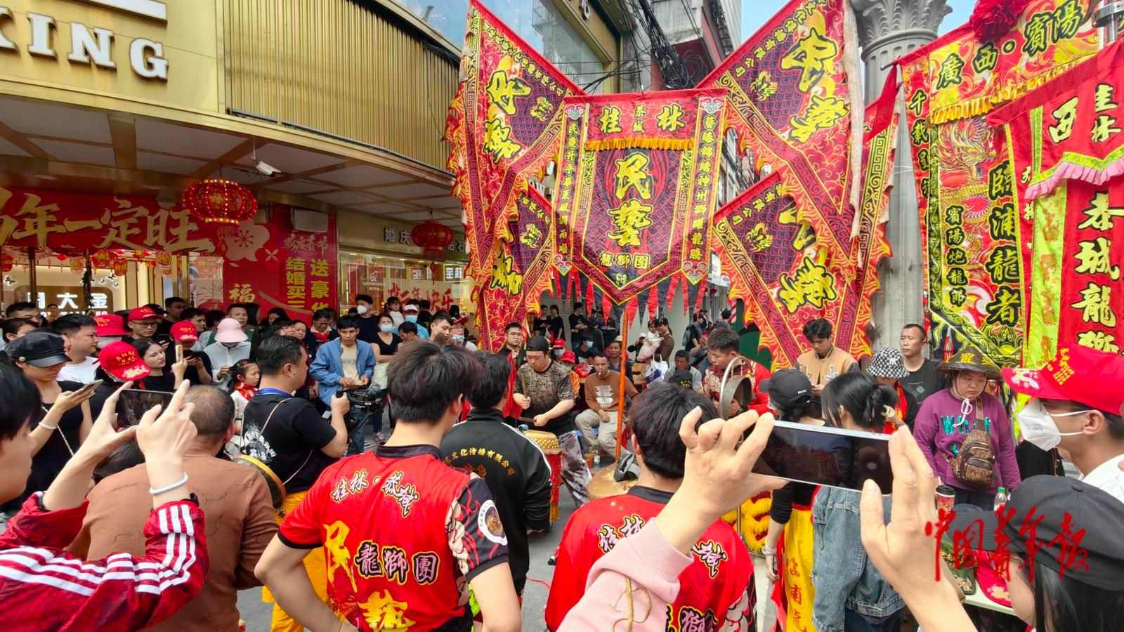 2月27日,广西南宁市宾阳县临浦路,来自桂林恭城的龙狮团当街表演,欢快的锣鼓声吸引游客驻足观看。中青报·中青网记者 谢洋/摄
