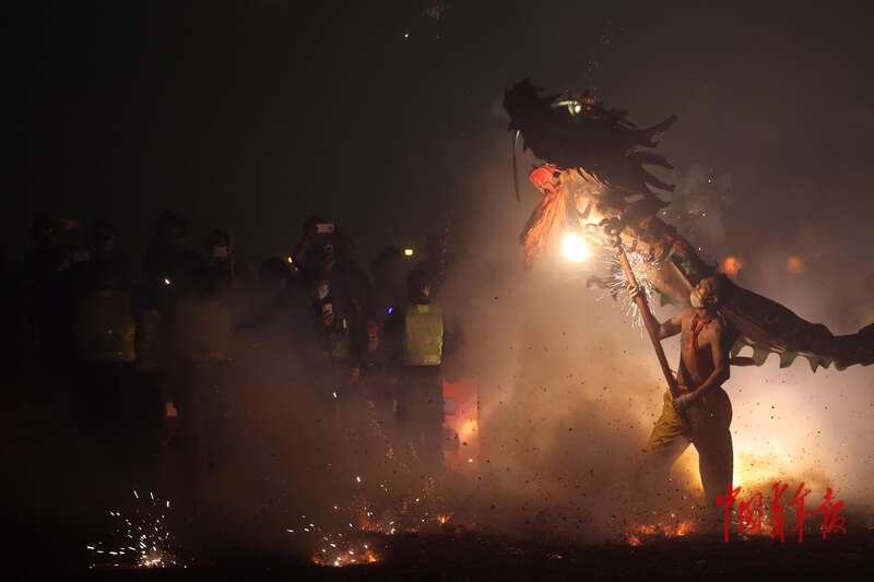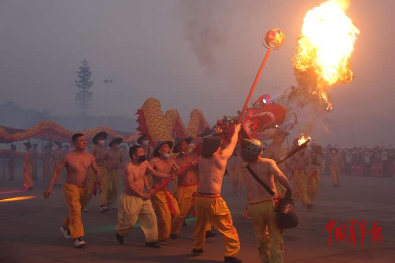 2月27日,广西南宁市宾阳县炮龙文化广场,舞龙者表演“真龙吐火”绝技。 中青报·中青网记者 谢洋/摄