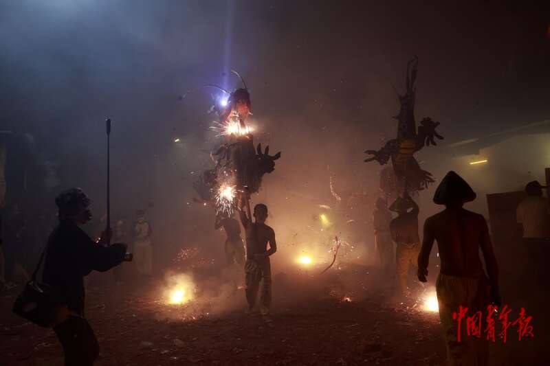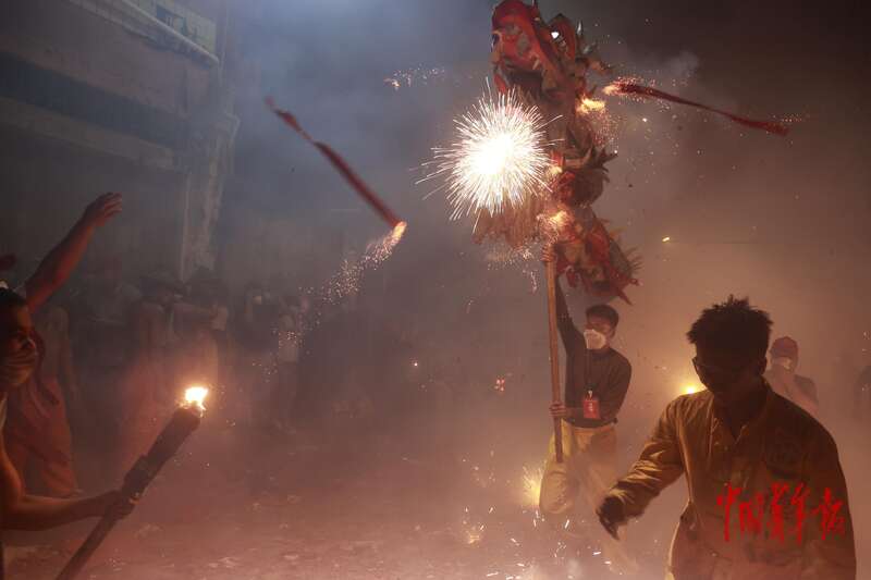 2月27日,广西南宁市宾阳县兴仁街,赤膊上阵的舞龙者从燃放的鞭炮中穿过,被视为守护福气的勇士。中青报·中青网记者 谢洋/摄