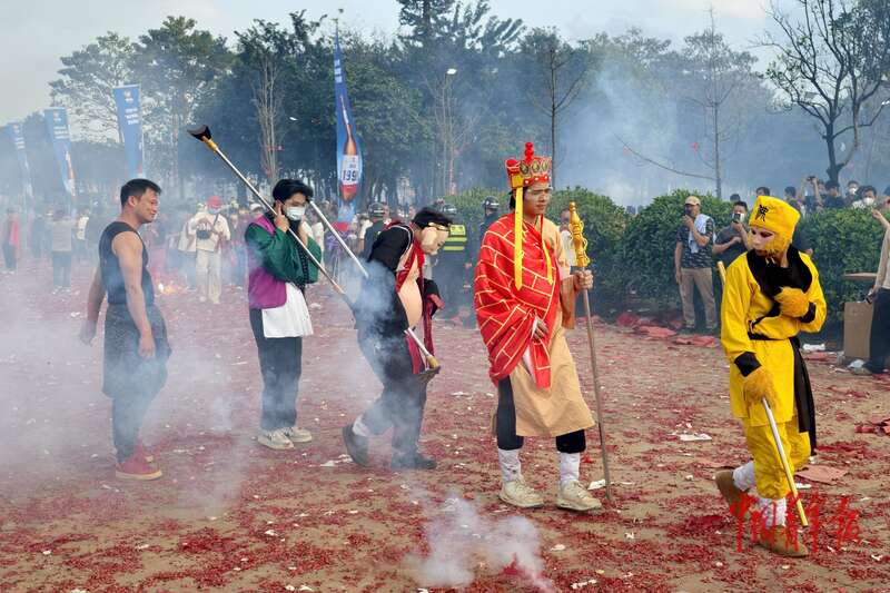2月27日,广西南宁市宾阳县炮龙文化广场,演员扮成唐僧师徒四人参加2026年宾阳炮龙节百龙舞宾州活动。中青报·中青网记者 谢洋/摄