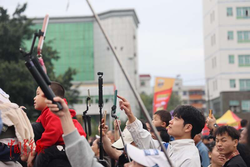 2月26日,广西南宁市宾阳县,游客和自媒体创作者纷纷用各种设备拍下炮龙队伍巡游展示的精彩画面。中青报·中青网记者 谢洋/摄