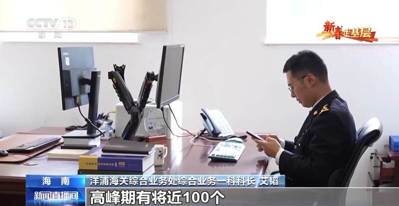 洋浦海关综合业务处综合业务一科科长 艾韬:有时候晚上10点、11点的电话一样得接,以前一天大概是10到20个,在临近封关前的几个月,我们的咨询量就开始慢慢增长,后面就稳定在40到60个,高峰期有将近100个,这也从侧面反映了自贸港的政策在全国的影响力越来越广。