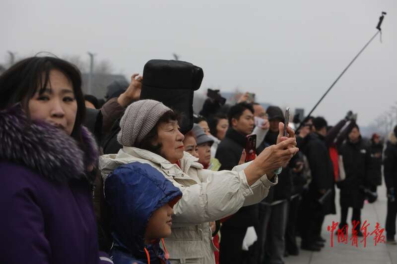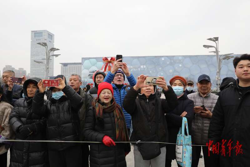 2月28日上午,北京中轴线玲珑塔旁的庆典广场,来自浦江职业技术学院的学生们在围观刚刚录制的视频。中青报·中青网记者 孔斯琪/摄