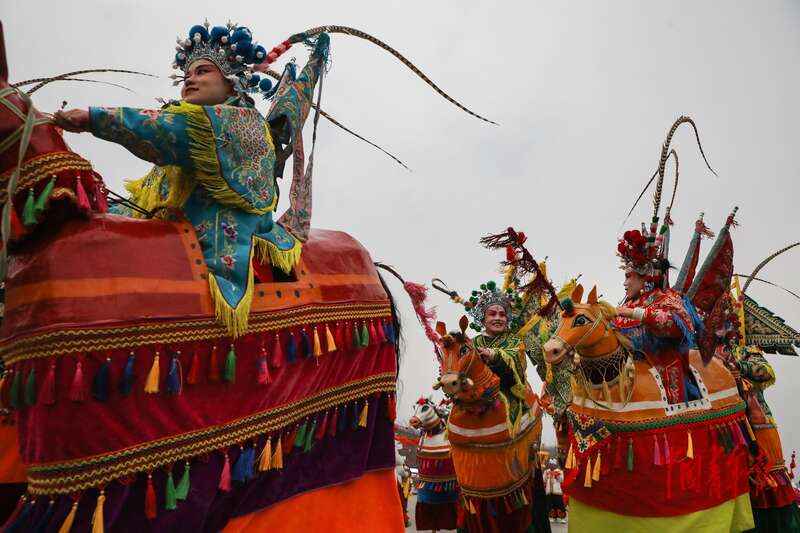 2月28日上午,北京中轴线玲珑塔旁的庆典广场,“非遗贺新春 民俗闹红火” 系列活动现场,来自山西寿阳的高跷竹马戏展演。中青报·中青网记者 孔斯琪/摄