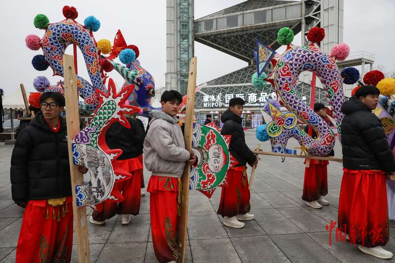 2月28日上午,北京中轴线玲珑塔旁的庆典广场,来自浦江职业技术学院的学生们在准备浙江浦江板凳龙展演。中青报·中青网记者 孔斯琪/摄
