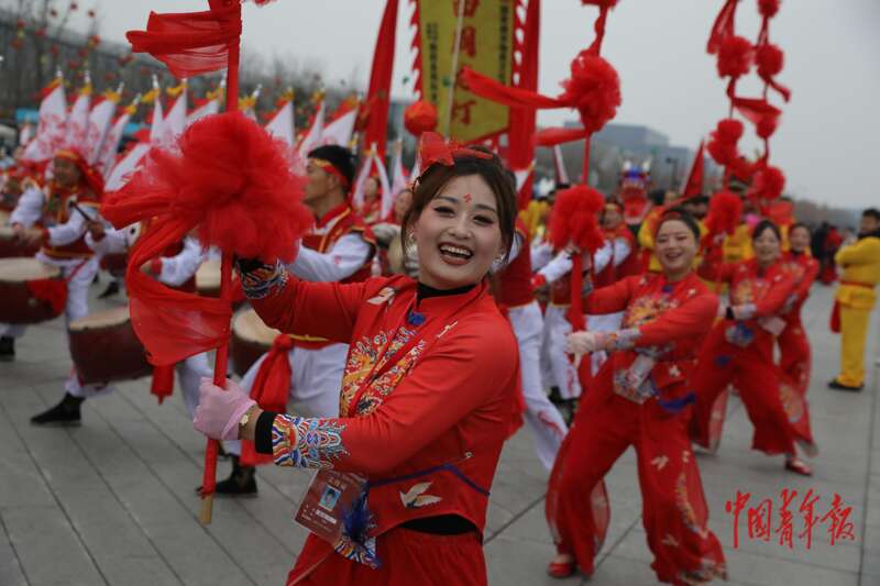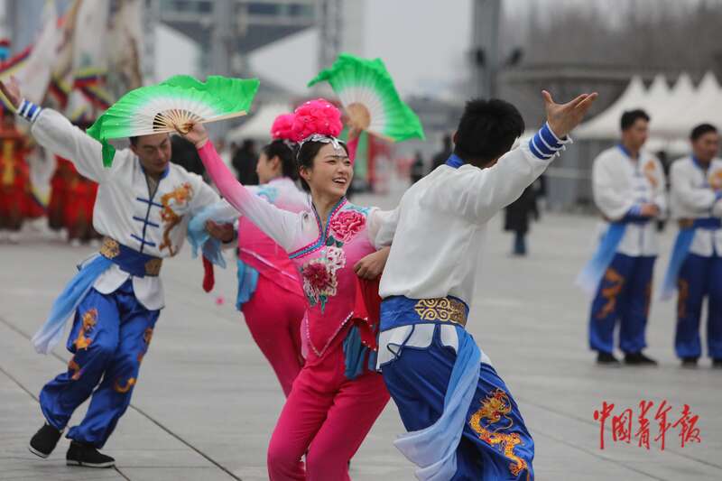 2月28日上午,北京中轴线玲珑塔旁的庆典广场,“非遗贺新春 民俗闹红火” 系列活动现场,演员们激情澎湃地表演陕西韩城天地社火。中青报·中青网记者 孔斯琪/摄