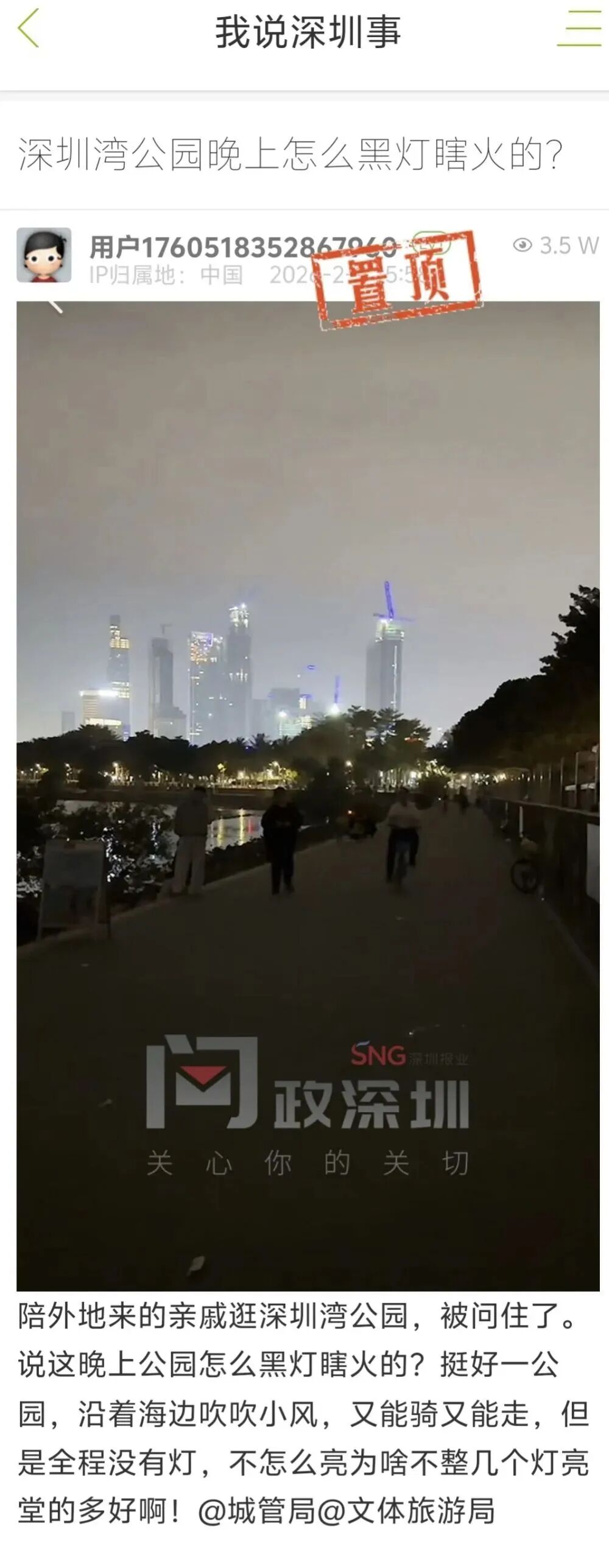 近日,有关深圳湾公园的两则新闻引发关注。一是有网友反映,夜间在深圳湾公园散步时,发现部分道路照明较暗,希望增设路灯。二是有网友发帖,建议深圳湾公园放开投喂海鸥。然而,这两条建议均被公园管理方面拒绝。