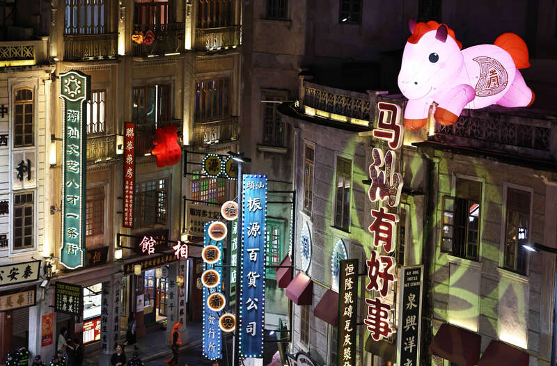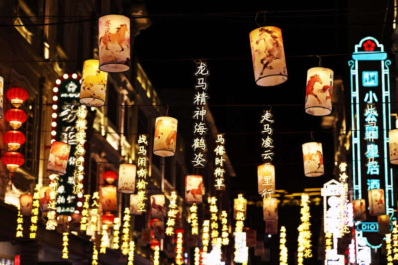 3月3日晚,广东汕头,小公园开埠文化区街道上悬挂着与马有关的诗句,成为特色一景。刘占崑/摄
