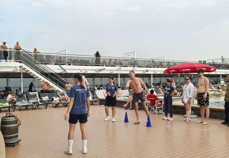 现在,毛乾勋每天的工作,除了实时追踪航班信息,就是为团员预订当天娱乐活动的入场票,他鼓励他们去看船上的剧院演出和乐队表演。一些老人英文不好,他买来扑克牌帮他们“缓解焦虑”。在船上,还有不少外国游客跳健身操、在泳池边晒太阳。