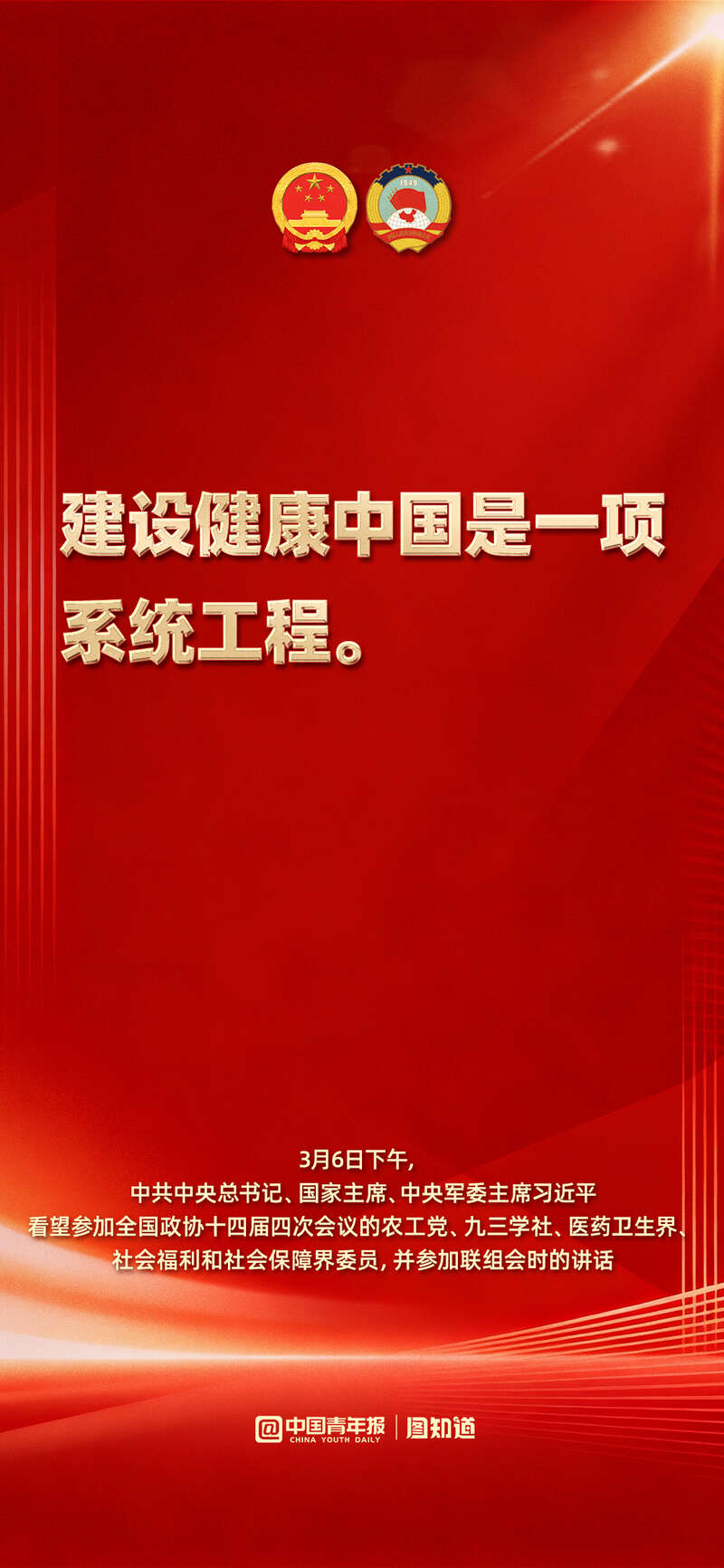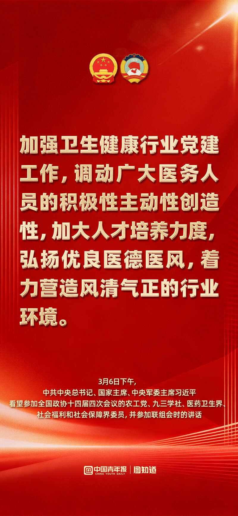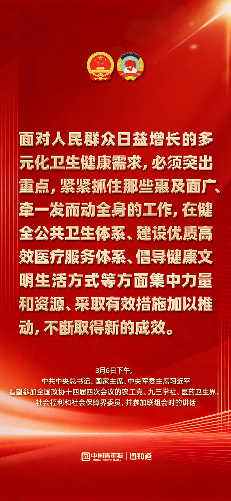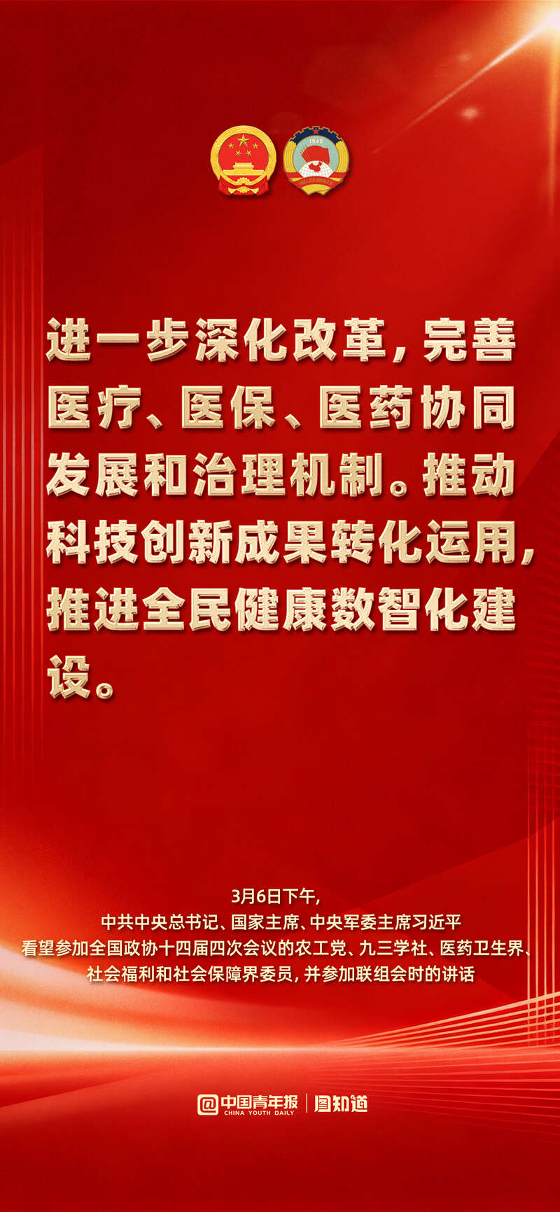 3月6日下午,中共中央总书记、国家主席、中央军委主席习近平看望了参加全国政协十四届四次会议的农工党、九三学社、医药卫生界、社会福利和社会保障界委员,并参加联组会,听取意见和建议。他强调: