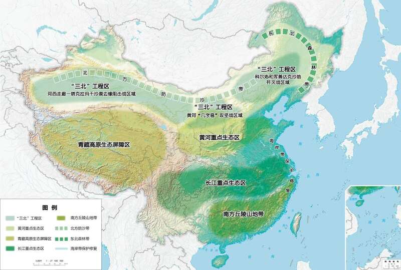 “三区”+1——青藏高原生态屏障区、黄河重点生态区、长江重点生态区+“三北”工程区;