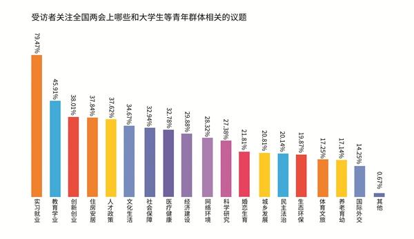 2026年全国两会召开之际,中国青年报·中青校媒面向以大学生为主的青年发起问卷调查,了解他们关注的两会议题,共回收1797份有效问卷。调查结果显示,实习就业(79.47%)、教育学业(45.91%)、创新创业(38.01%)、住房安居(37.84%)、人才政策(37.62%)等议题备受关注。