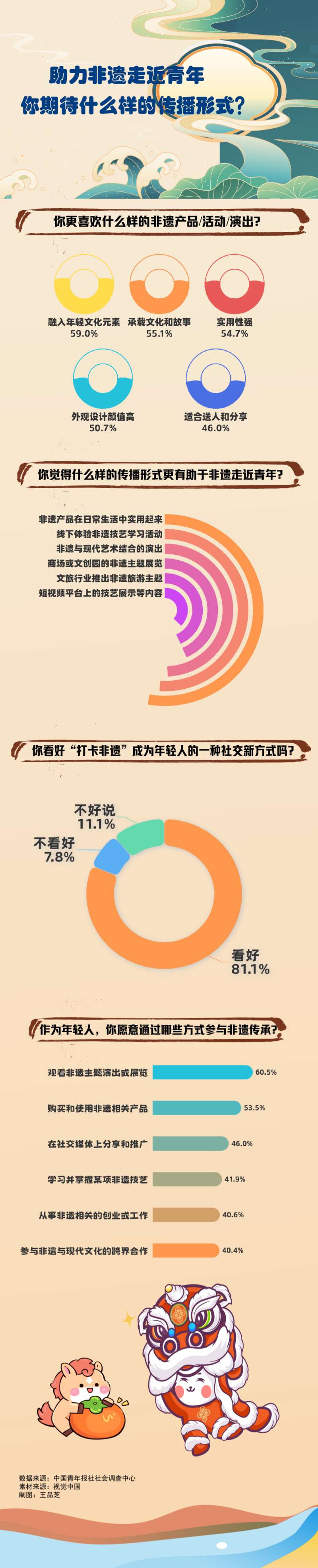 当非遗从展柜走进日常,它如何与年轻人同频共振?中国青年报社社会调查中心对1500名出生于1990年至2009年的青年进行的一项调查显示,大家对于融入年轻文化元素(59.0%)、承载着文化情怀和故事(55.1%)、实用性强(54.7%)的非遗产品/活动/演出更感兴趣。助力非遗走近青年,53.5%的受访青年期待非遗产品更实用,50.0%的受访青年希望多些非遗与现代艺术结合的演出。81.1%的受访青年看好“打卡非遗”成为年轻人的一种社交新方式。#读数