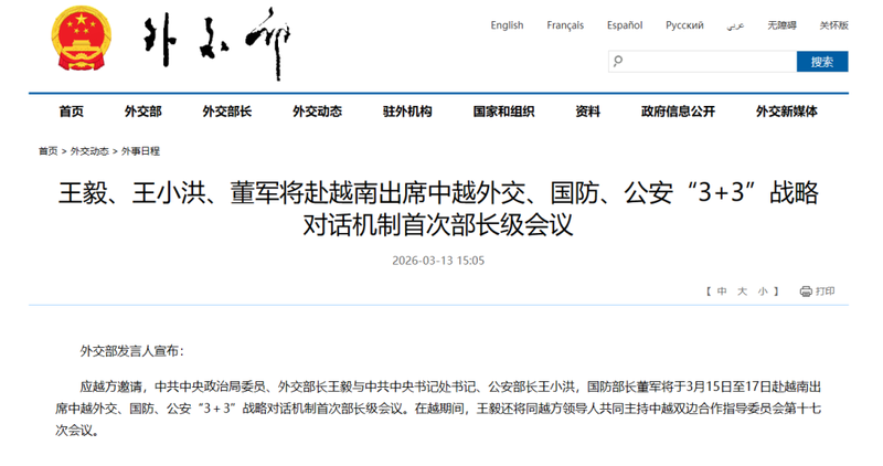 应越方邀请,中共中央政治局委员、外交部长王毅与中共中央书记处书记、公安部长王小洪,国防部长董军将于3月15日至17日赴越南出席中越外交、国防、公安“3+3”战略对话机制首次部长级会议。在越期间,王毅还将同越方领导人共同主持中越双边合作指导委员会第十七次会议。