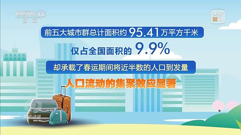 春运40天期间,城市群成为全国人口流动热点区域。长三角、京津冀、成渝、珠三角和长江中游城市群位居全国人口流动前五大区域,日均到发量均超过3000万人次,前五大城市群总计面积约95.41万平方千米,仅占全国面积的9.9%,却承载了春运期间将近半数的人口到发量,人口流动的集聚效应显著。