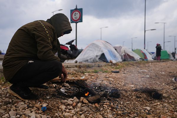 当地时间2026年3月15日,黎巴嫩贝鲁特,因以色列空袭而流离失所的民众在贝鲁特海滨的公共区域搭建帐篷,一名男子在小火堆旁取暖。