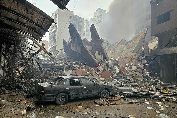 当地时间2026年3月15日,黎巴嫩贝鲁特,以色列空袭导致贝鲁特南郊哈里特·赫雷克地区一栋建筑倒塌,废墟堵塞道路。一名官员向法新社表示,黎巴嫩正努力组建代表团与以色列谈判,以停止与伊朗支持的真主党的战争,不过以色列尚未承诺参与这一倡议。