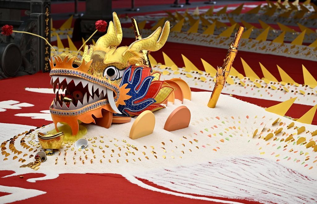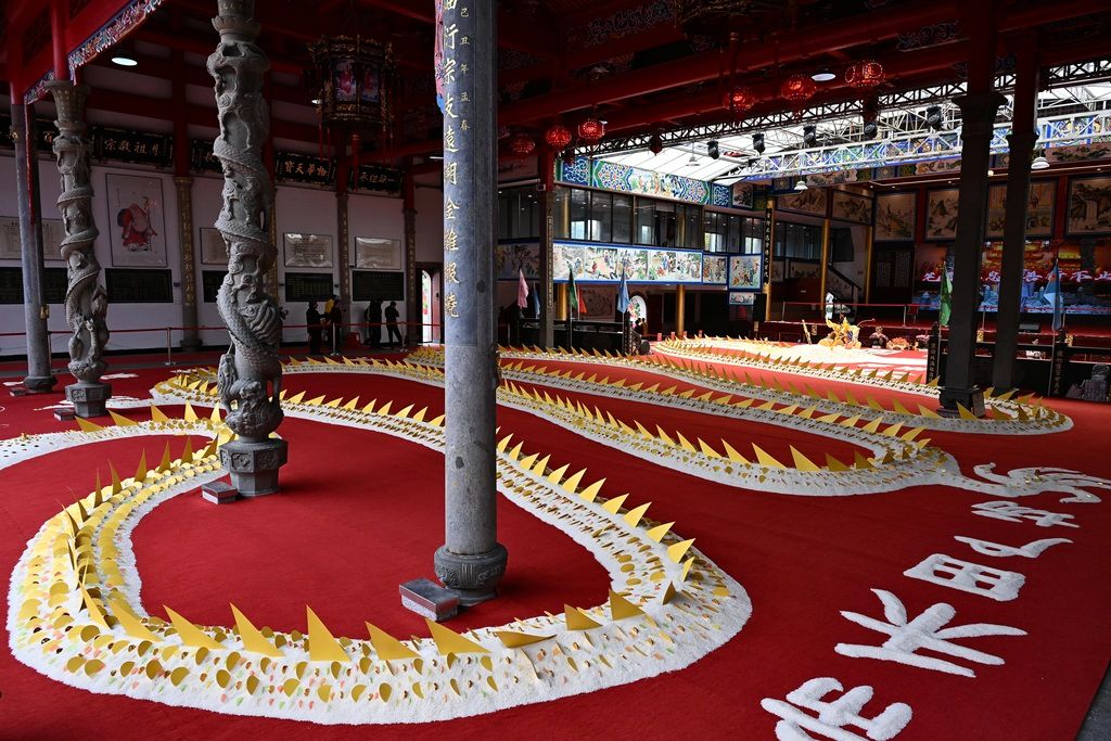 2026年3月16日,在胪峰陈氏祠堂内展示的巨型“米龙”。近日,一条寓意风调雨顺、五谷丰登,由大米制作而成的巨型“米龙”在福州市城门镇胪雷村胪峰陈氏祠堂内展示,吸引民众前来参观。据了解,“米龙”结束展示后,大米将分给村民。 中新社记者 张斌 摄