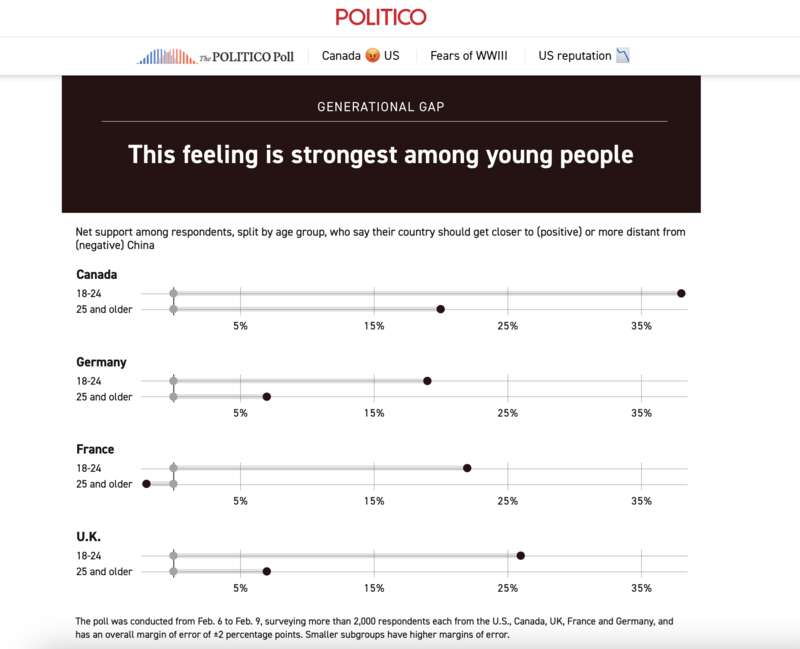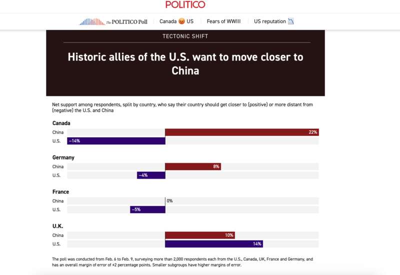 “政治”新闻网调查发现,这4个国家的受访者普遍支持本国与美国保持一定距离;他们认为,本国对中国的依赖正在加深。以加拿大为例,该国48%的受访者表示,减少对美国的依赖是可行的,他们认为政府应采取相关举措。