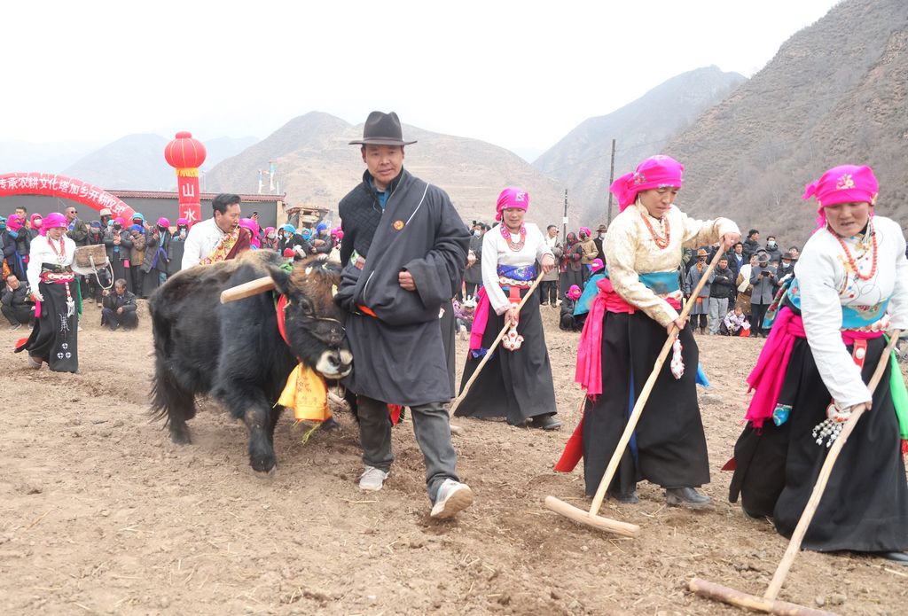 2026年3月21日,在青海省化隆回族自治县塔加藏族乡,民众身着盛装,遵循传统习俗,牵引耕牛,在素有“百年藏庄”之称的塔二村举行春耕仪式,播撒春日第一粒种子。图为民众以“二牛抬杠”耕作模式开启春耕。中新社记者 张忠苹 摄
