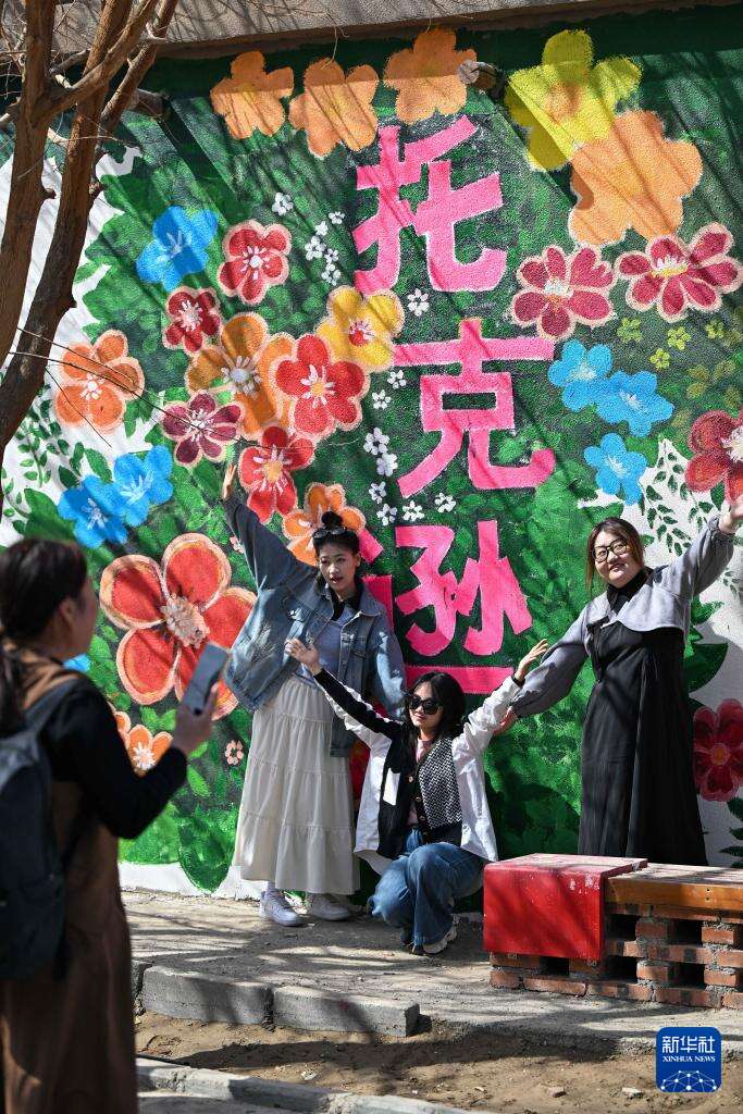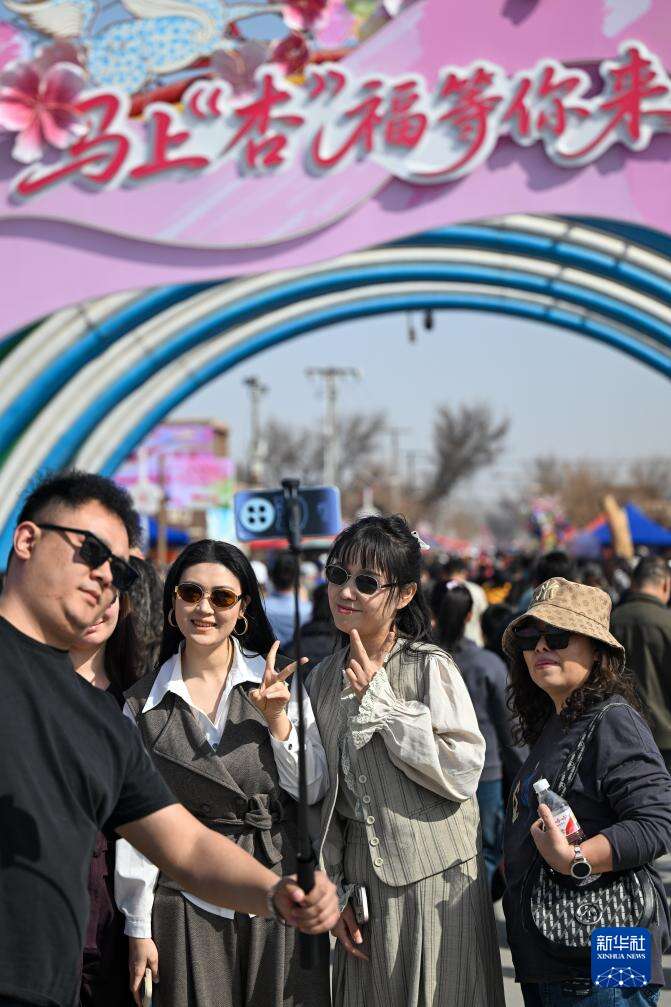 3月20日,在新疆吐鲁番市托克逊县南湖杏花村,游客在杏园打卡拍照。